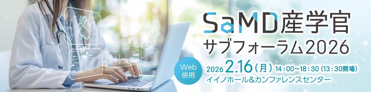 「プログラム医療機器実用化促進パッケージ戦略」に基づき、経済産業省、厚生労働省、AMEDの共催にて、SaMD産学官サブフォーラム2026を開催します。本サブフォーラムにおいては、「SaMDの海外展開における現状と課題について」と「SaMDの価値の国内での実証と実装について」の2テーマについて議論を深めます。フォーラム終了後に、ネットワーキングを目的として情報交換会も開催します。事前登録の上、ぜひご参加ください。